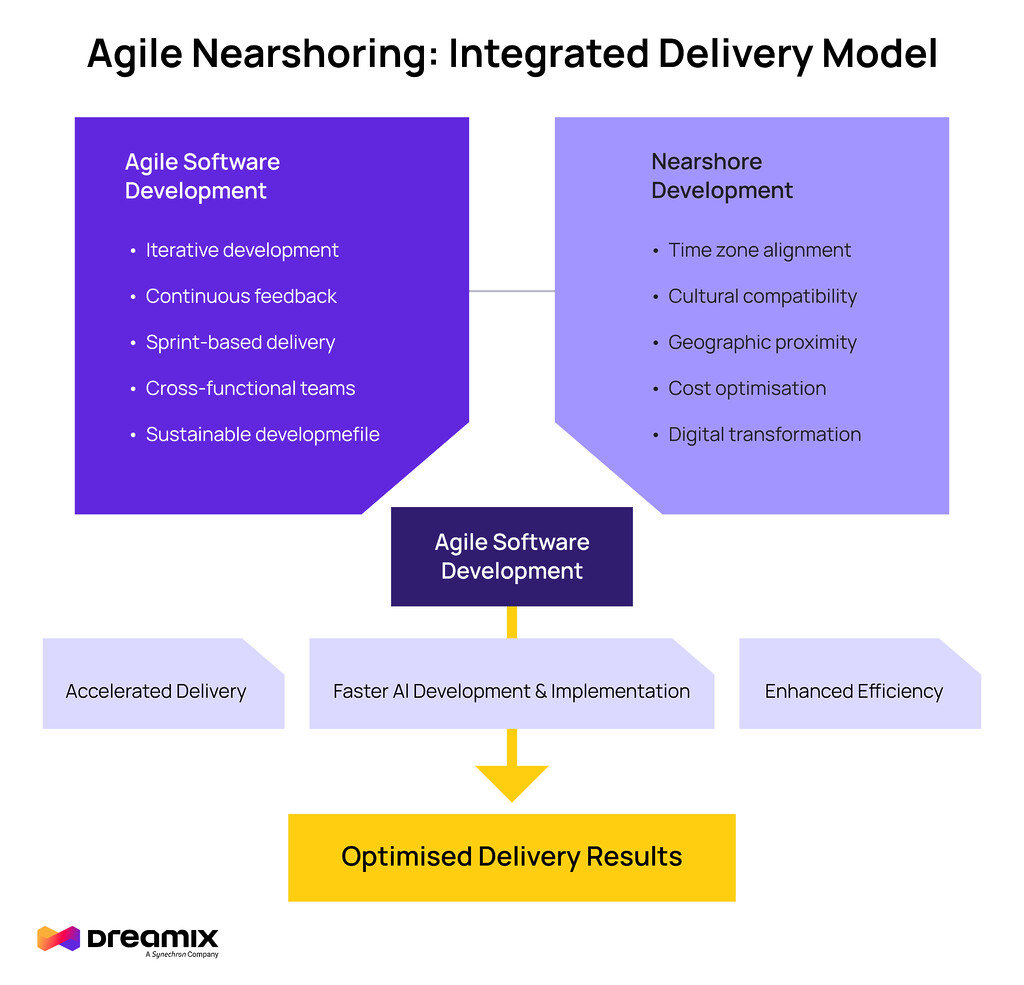 These elements combine seamlessly with nearshore advantages of time zone alignment, cultural compatibility, geographic proximity, cost optimisation, and digital transformation expertise. This integration produces a comprehensive framework that delivers three key outcomes: accelerated delivery timelines, faster custom AI development, and enhanced overall efficiency. The visual representation clearly demonstrates how this synergistic approach ultimately leads to optimised delivery results, making it an appealing model for organisations seeking to leverage global talent while maintaining agile principles.