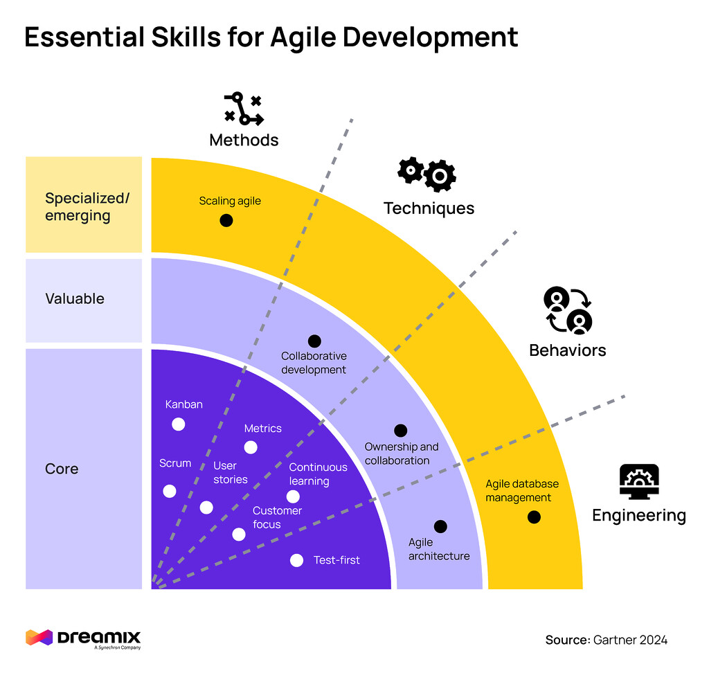 Mastering the agile development landscape requires a strategic approach to skills acquisition and implementation. As illustrated in the Gartner 2024 infographic below, successful agile methodologies are built on Scrum, Kanban, user stories and utilise customer focus, and test-first approaches. But beyond these fundamentals, valuable skills include collaborative development, ownership and collaboration, and agile architecture—all essential elements for teams to function cohesively.
