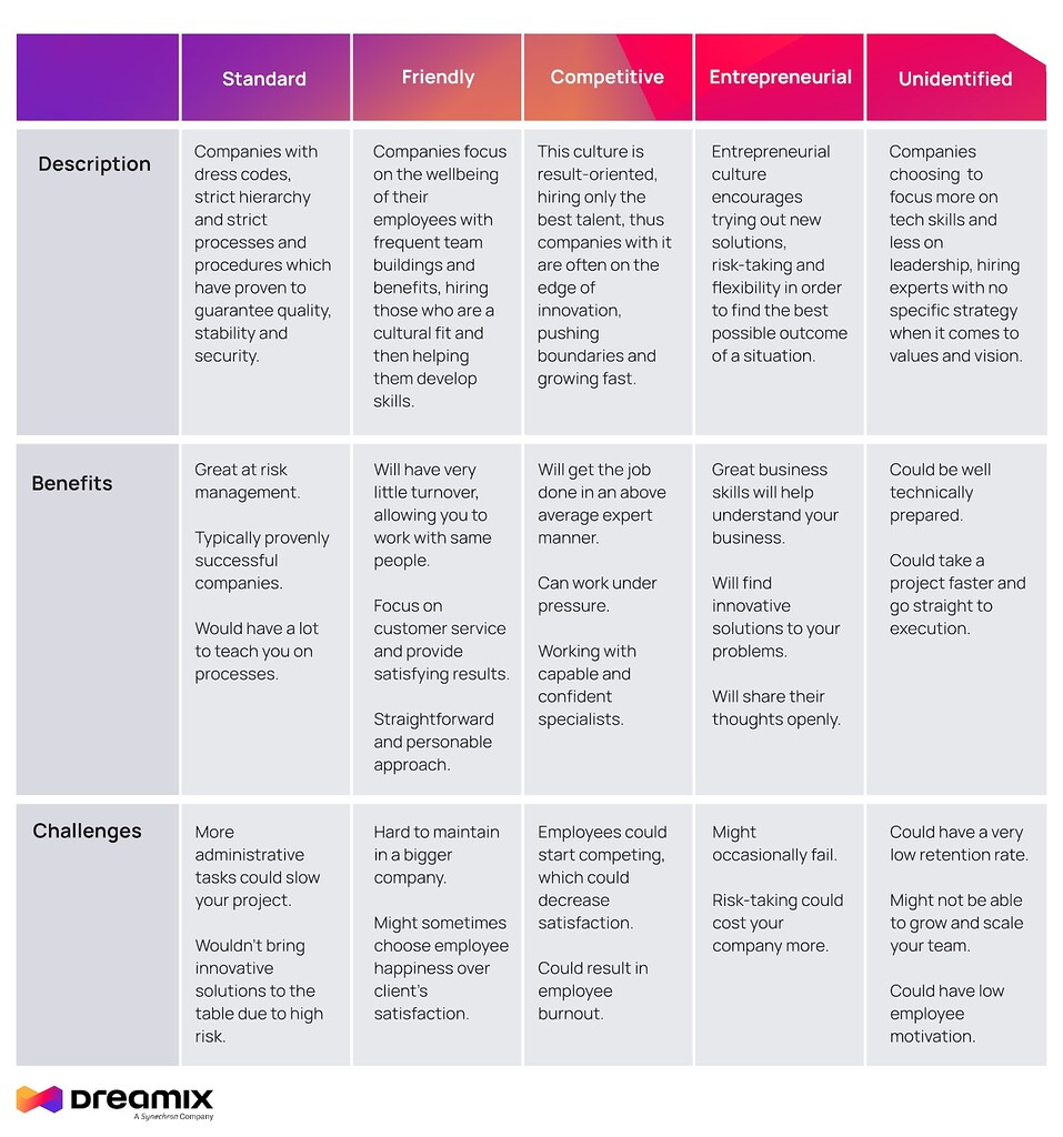 Choose a company which has a culture similar to yours and either has the exact same values, vision and beliefs, or pick one which could add value to your project with something your team lacks. This table provides a comprehensive overview of different company cultures, helping you identify which environment aligns best with your organisation's values and project needs. It categorizes companies into types such as Standard, Friendly, Competitive, Entrepreneurial, and Unidentified, outlining their core characteristics, benefits, and potential challenges.